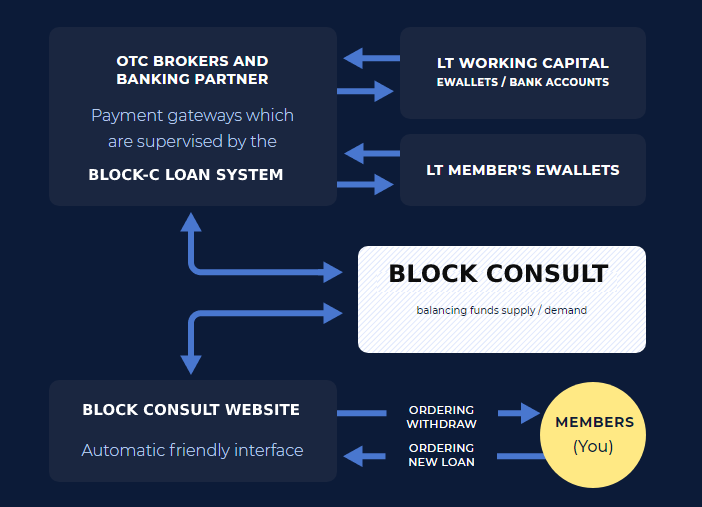 The above diagram shows how Metro Profits 's platform mediates external funds between us, our members and BC brokers / traders. BC TRADING APP is highlighted in the middle - it acts as a central processing unit (internal logistics are shown on the diagram above).
